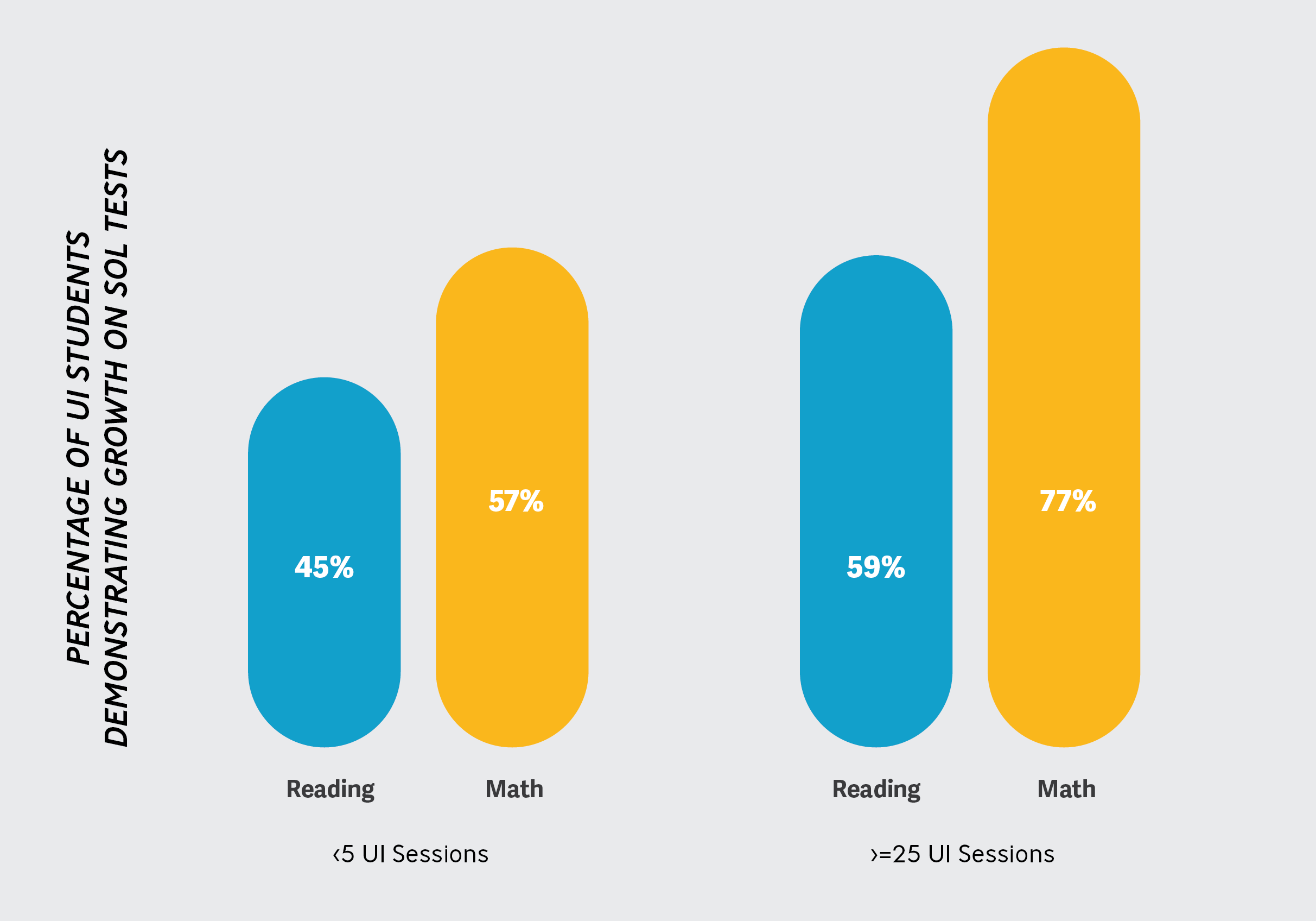 Statistically significant percentage of UI students increasing their score on state testing correlated to number of UI sessions they attended